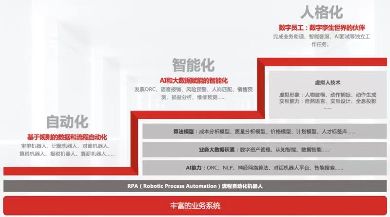 不同于閱讀、聊天、搜索等面向終端用戶的應用場景,人工智能在企業(yè)級領域的應用更具復雜性。在這一過程中,從早期依托RPA技術實現基于規(guī)則的數據和流程自動化,到借助OCR、NLP、算法模型等實現AI和大數據賦能的智能化,再到基于虛擬人技術的數智員工的誕生,AI技術在企業(yè)領域的應用歷經自動化、智能化、人格化的發(fā)展過程。