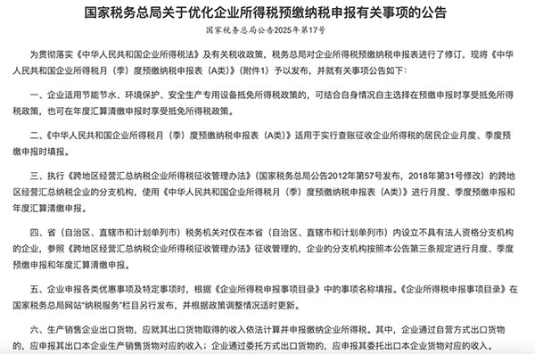 近期,國家稅務(wù)總局發(fā)布的《關(guān)于優(yōu)化企業(yè)所得稅預(yù)繳納稅申報有關(guān)事項的公告》(國家稅務(wù)總局公告 2025 年第 17 號),則為小微企業(yè)帶來了諸多利好。