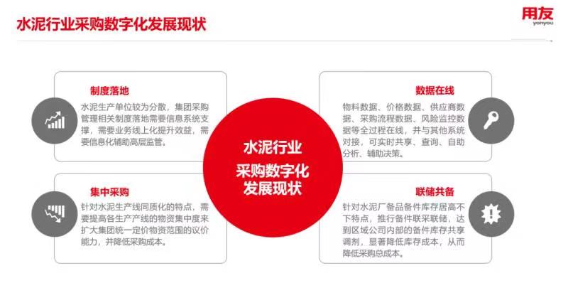 用友以企業(yè)采購數(shù)智化變革研究為基礎,針對水泥行業(yè)進行專項分析,發(fā)布用友BIP水泥行業(yè)采購及供應鏈解決方案。