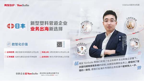 日豐集團(tuán)自1996年成立以來,在管道產(chǎn)品領(lǐng)域深耕二十余載,為億萬家庭提供全屋管道系統(tǒng)解決方案。隨著品牌走向國際,其在海外業(yè)務(wù)運(yùn)營協(xié)同和管理上面臨諸多挑戰(zhàn)。在此背景下,日豐選擇用友YonSuite作為海外拓展的數(shù)智化伙伴,取得了顯著成效:實(shí)現(xiàn)了更高效管理,極大提升了財(cái)務(wù)的工作效率和全球的協(xié)同效率,有力推動(dòng)企業(yè)在全球業(yè)務(wù)的拓展。