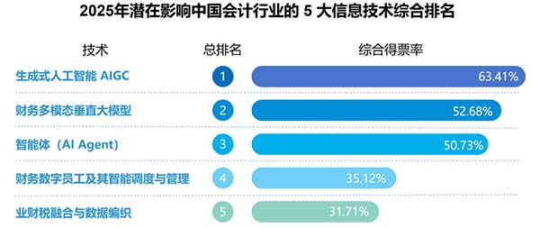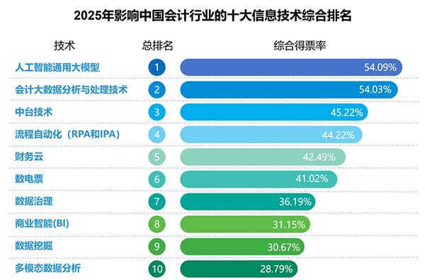 以往評選結果相對穩(wěn)定,今年卻發(fā)生顯著變化,人工智能通用大模型、多模態(tài)數據分析都是第一次出現在榜單中。同時,新一代ERP(曾連續(xù)5年入選)、電子會計檔案(曾連續(xù)8年入選)則退出了榜單。新興技術以顛覆性姿態(tài)加入,傳統熱門技術逐漸淡出,這表明會計科技正處于快速變革的關鍵節(jié)點。