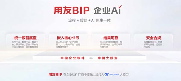 年初,用友BIP企業(yè)AI的發(fā)布,為企業(yè)應(yīng)用AI提供了落地抓手。面對眾多企業(yè)在系統(tǒng)分散、數(shù)據(jù)孤島中的困境,用友結(jié)合企業(yè)AI的四大特性——統(tǒng)一數(shù)智底座、嵌入核心業(yè)務(wù)、結(jié)果可靠、安全合規(guī),提出了一個關(guān)鍵性命題:真正有效果的、可持續(xù)輸出價值的AI,必須扎根于“原生一體化”的土壤之中。