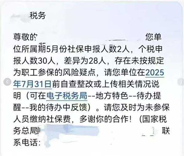 您單位所屬期5月份社保申報(bào)人數(shù)2人,個稅申報(bào)人數(shù)30人,差異28人,存在未按規(guī)定為職工參保的風(fēng)險(xiǎn)疑點(diǎn),請您單位在2025年7月31日前自查整改或上傳相關(guān)情況說明。請您及時(shí)為參保人員繳納社保費(fèi),多謝你的合作!”