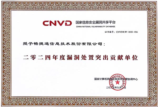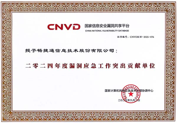 憑借成熟的安全管理體系和規(guī)范化的安全運營能力,用友暢捷通榮獲“CNVD漏洞處置突出貢獻(xiàn)單位” 與 “CNVD漏洞應(yīng)急工作突出貢獻(xiàn)單位” 兩項國家級榮譽。這不僅是對暢捷通在網(wǎng)絡(luò)安全領(lǐng)域?qū)I(yè)能力的權(quán)威認(rèn)可,也體現(xiàn)了在保障客戶數(shù)據(jù)安全、筑牢數(shù)智防線方面的持續(xù)投入與扎實成果。