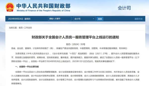 財(cái)政部發(fā)布《關(guān)于全國會(huì)計(jì)人員統(tǒng)一服務(wù)管理平臺(tái)上線運(yùn)行的通知》。