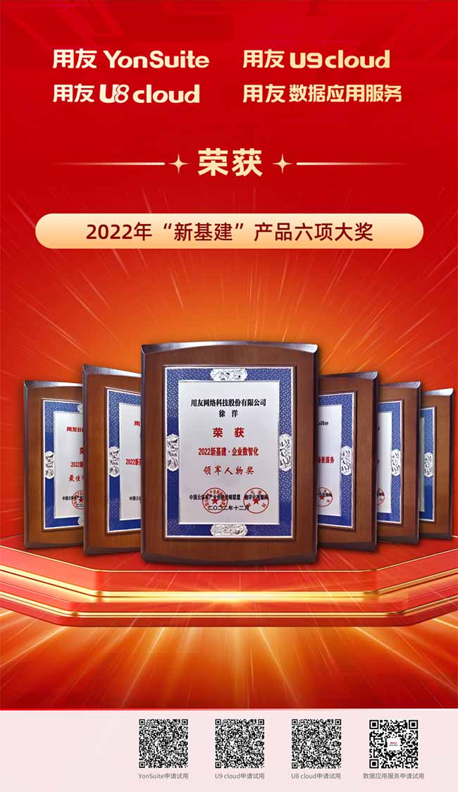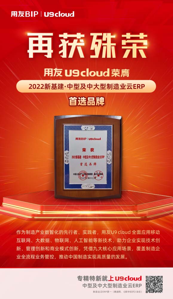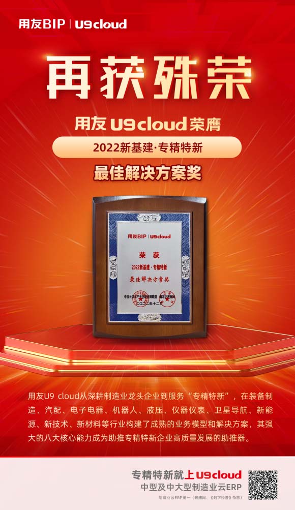 用友U9 cloud榮獲“2022新基建·中型及中大型制造業(yè)云ERP首選品牌”及“2022新基建·專精特新最佳解決方案獎”
