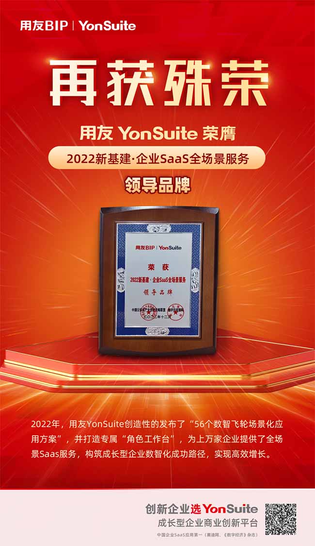 本次評選用友YonSuite榮獲“2022新基建·企業(yè)SaaS全場景服務(wù)領(lǐng)導(dǎo)品牌”,以實力引領(lǐng)創(chuàng)新,以技術(shù)領(lǐng)先性和創(chuàng)新性驅(qū)動企業(yè)高效增長,領(lǐng)跑中國SaaS產(chǎn)業(yè)發(fā)展。