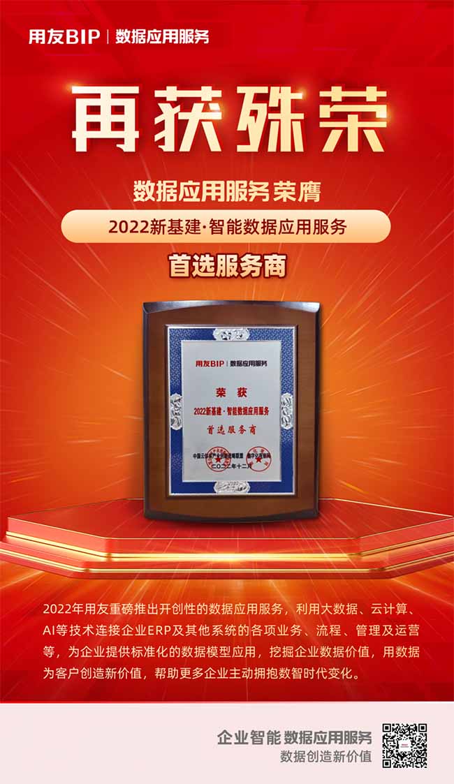 用友數(shù)據(jù)應(yīng)用服務(wù)憑借著先進(jìn)的技術(shù)架構(gòu)、創(chuàng)新的應(yīng)用模式和優(yōu)秀的客戶實踐,榮獲“2022新基建·智能數(shù)據(jù)應(yīng)用服務(wù)首選服務(wù)商”獎項。
